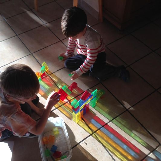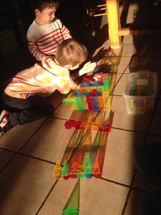 Les cubes translucides colorés étaient de sortie aujourd’hui ! Les enfants ont profité du beau soleil de la fin d’après midi pour jouer avec les ombres colorées des ces jolis cubes (enfin, il n’y a pas que des cubes, on est d’accord !)
