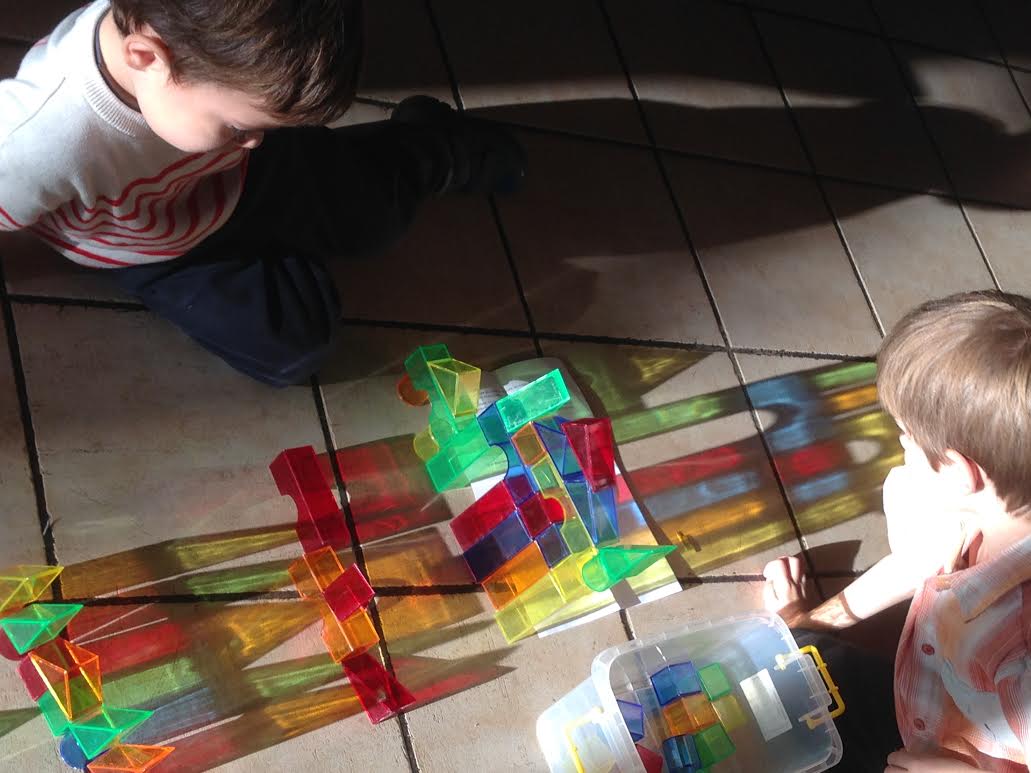 Les cubes translucides colorés étaient de sortie aujourd’hui ! Les enfants ont profité du beau soleil de la fin d’après midi pour jouer avec les ombres colorées des ces jolis cubes (enfin, il n’y a pas que des cubes, on est d’accord !)