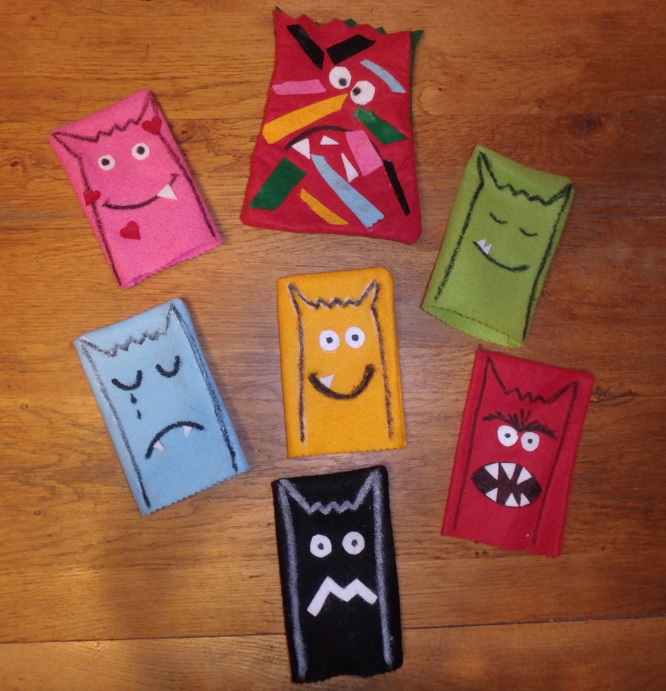 Et j’avais aussi vu sur Facebook (merci Aurélie ! Vous pouvez aller voir sa page Facebook Alternat’Vie pour plein d’autres idées ) l’idée de fabriquer des petits monstres à l’image des personnages du livre. Etant nulle en couture, j’ai proposé à la mamie des enfants de les fabriquer pour Noël ! Et voilà donc de jolies marionnettes en feutrine avec le sac pour les ranger !