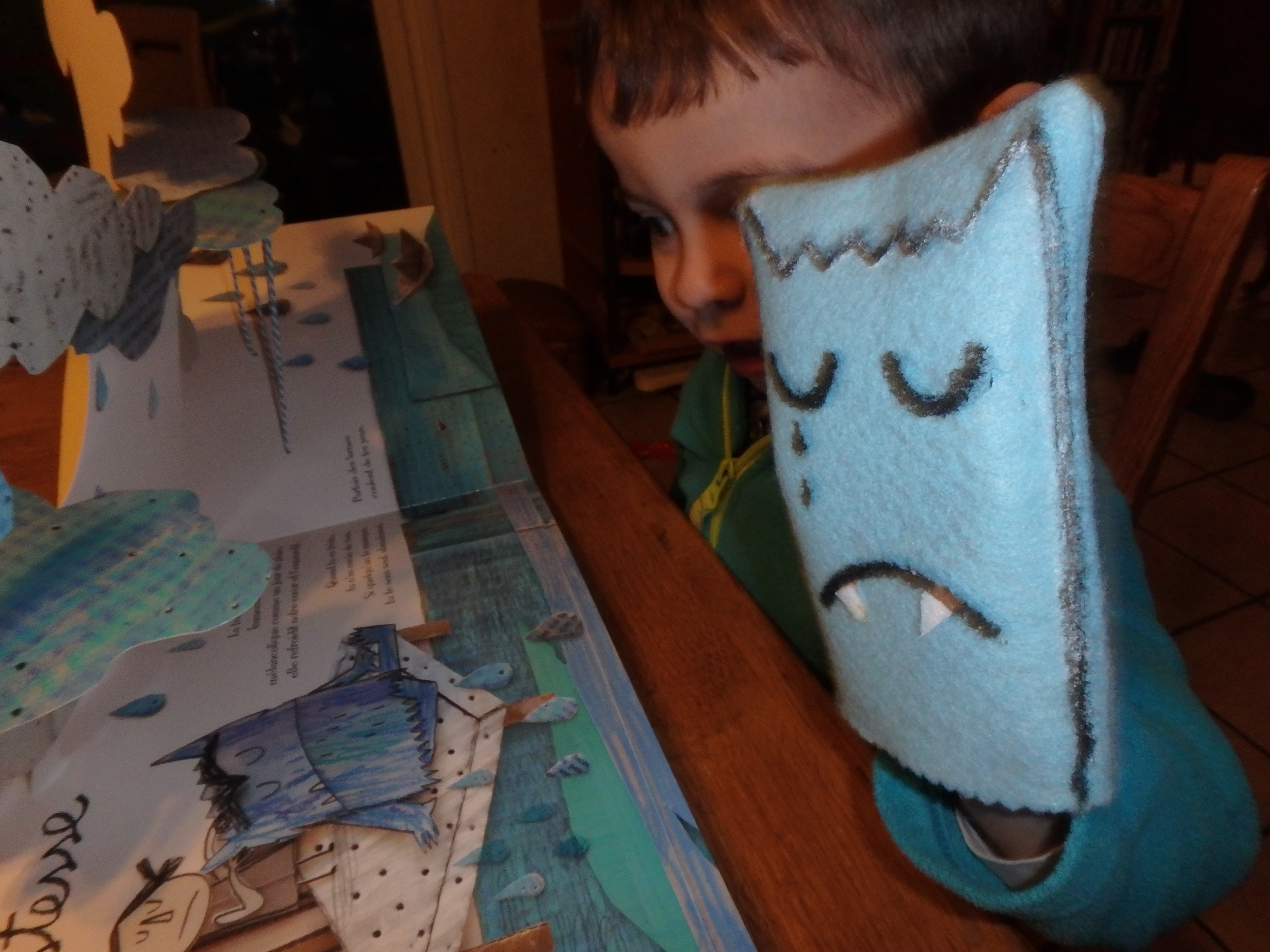 Marionnettes tout de suite adoptées ! Et de quoi parle ce livre ? D’un petit monstre tout embrouillé, tout barbouillé, pas bien parce que ses émotions sont toutes mélangées. Sa copine la petite fille va l’aider à mettre de l’ordre en lui expliquant les différentes émotions, le tout en pop up vraiment réussi !