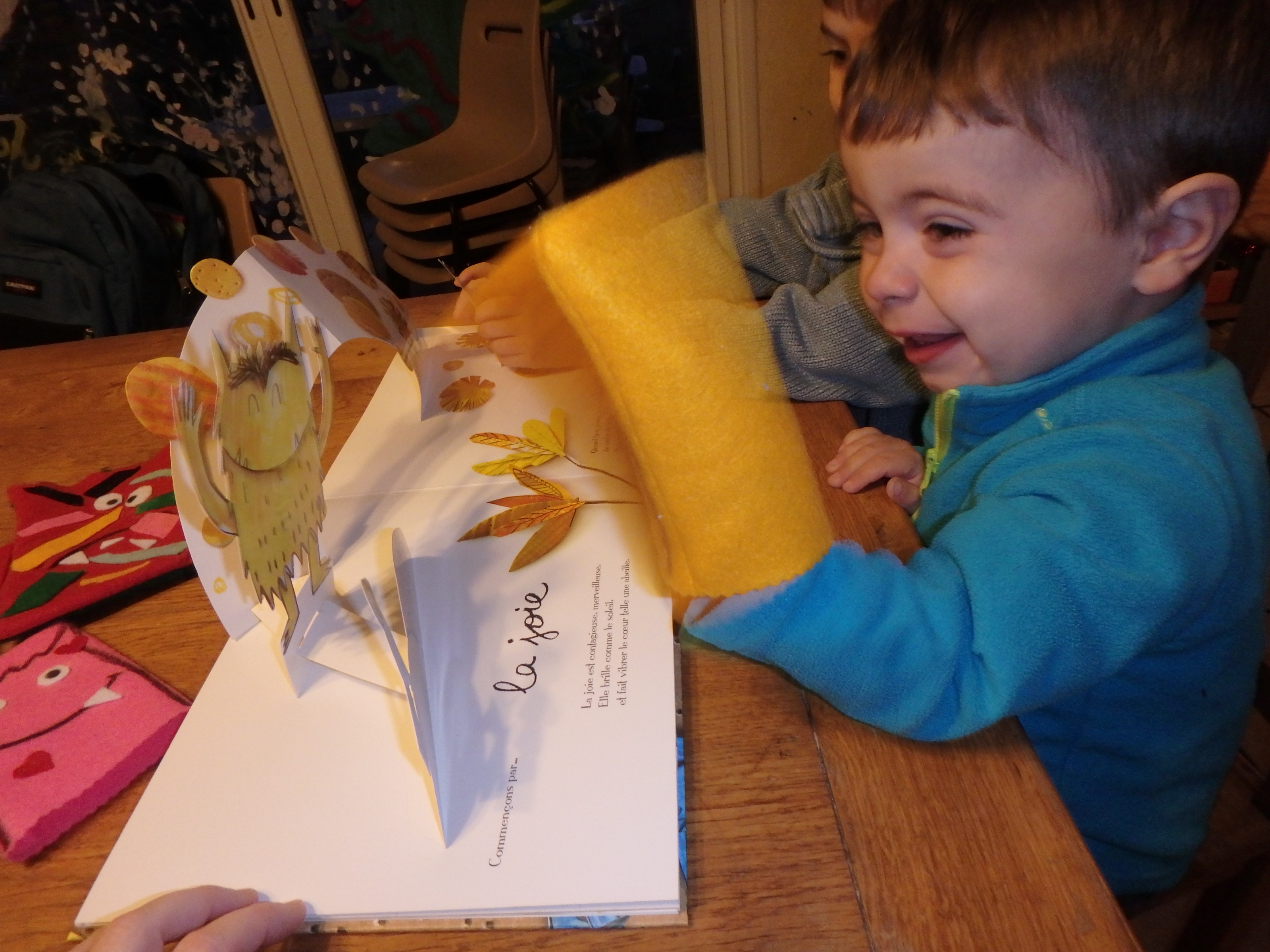 .. et la colère !!! Et d’entendre Firmin se raconter ses petites histoires avec le livre et les marionnettes, c’était trop drôle ! Leur papa m’a fait remarquer qu’il manquer deux émotions primaires importantes, le dégoût et la surprise (et que la sérénité n’en fait pas partie) mais bon !