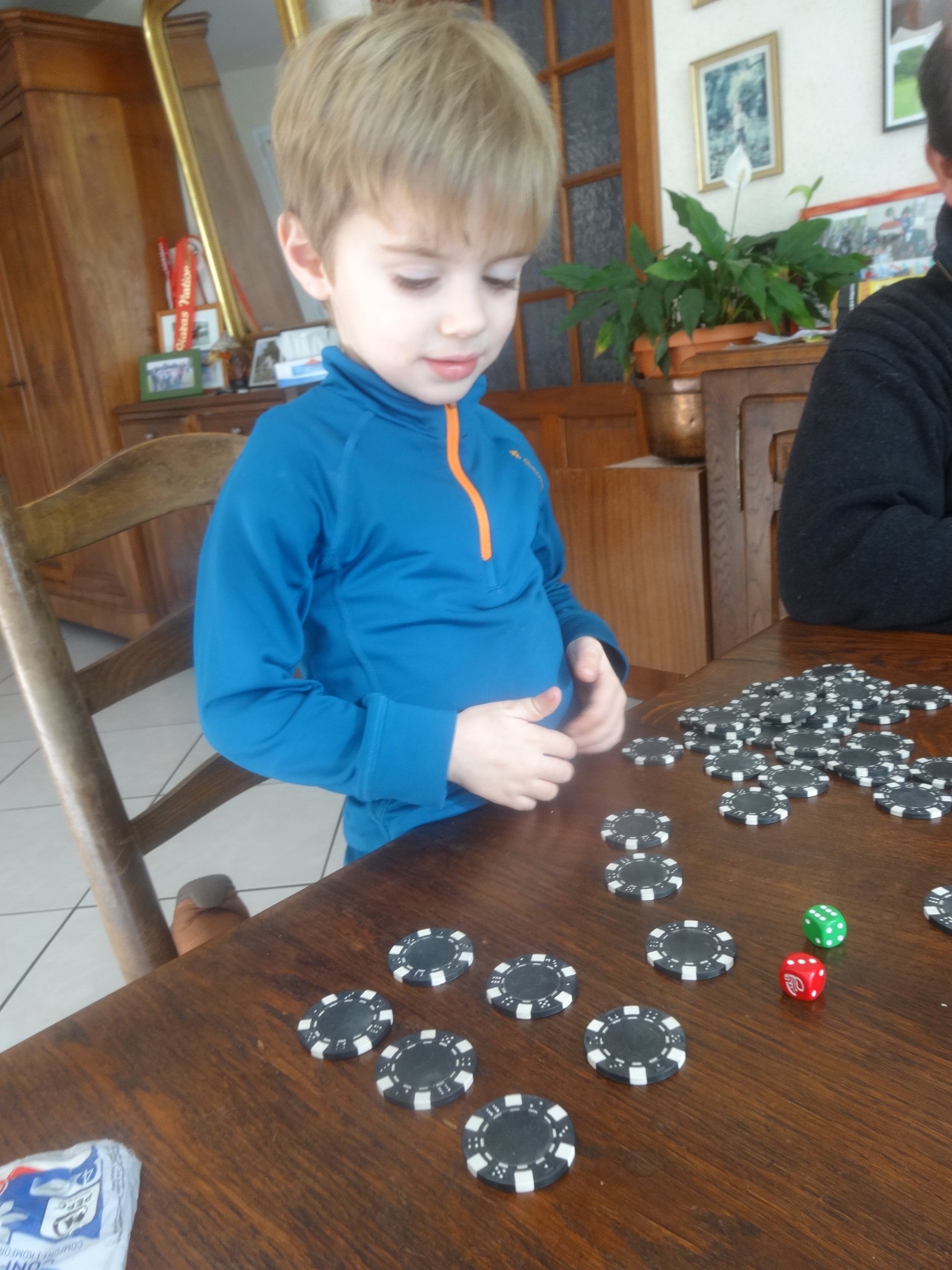 Mais situation de problème pour mon Fifi ! Quand il avait fini, il voulait transporter sa tour pour me la montrer par exemple. Et il l’attrapait par le milieu. Et tout tombait à son grand désespoir, ça l’énervait beaucoup ! Après l’avoir laissé chercher un moment, je lui ai montré qu’il fallait le prendre en bas, par la base. Et au bout de quelques fois, il réussit, très satisfait !