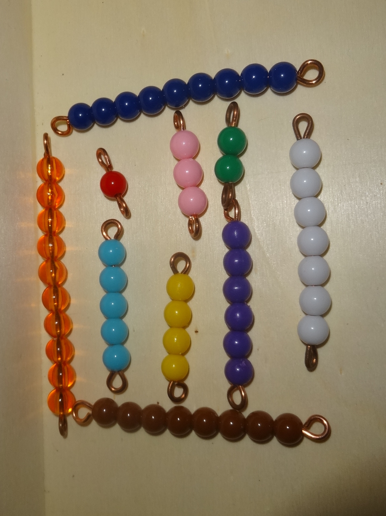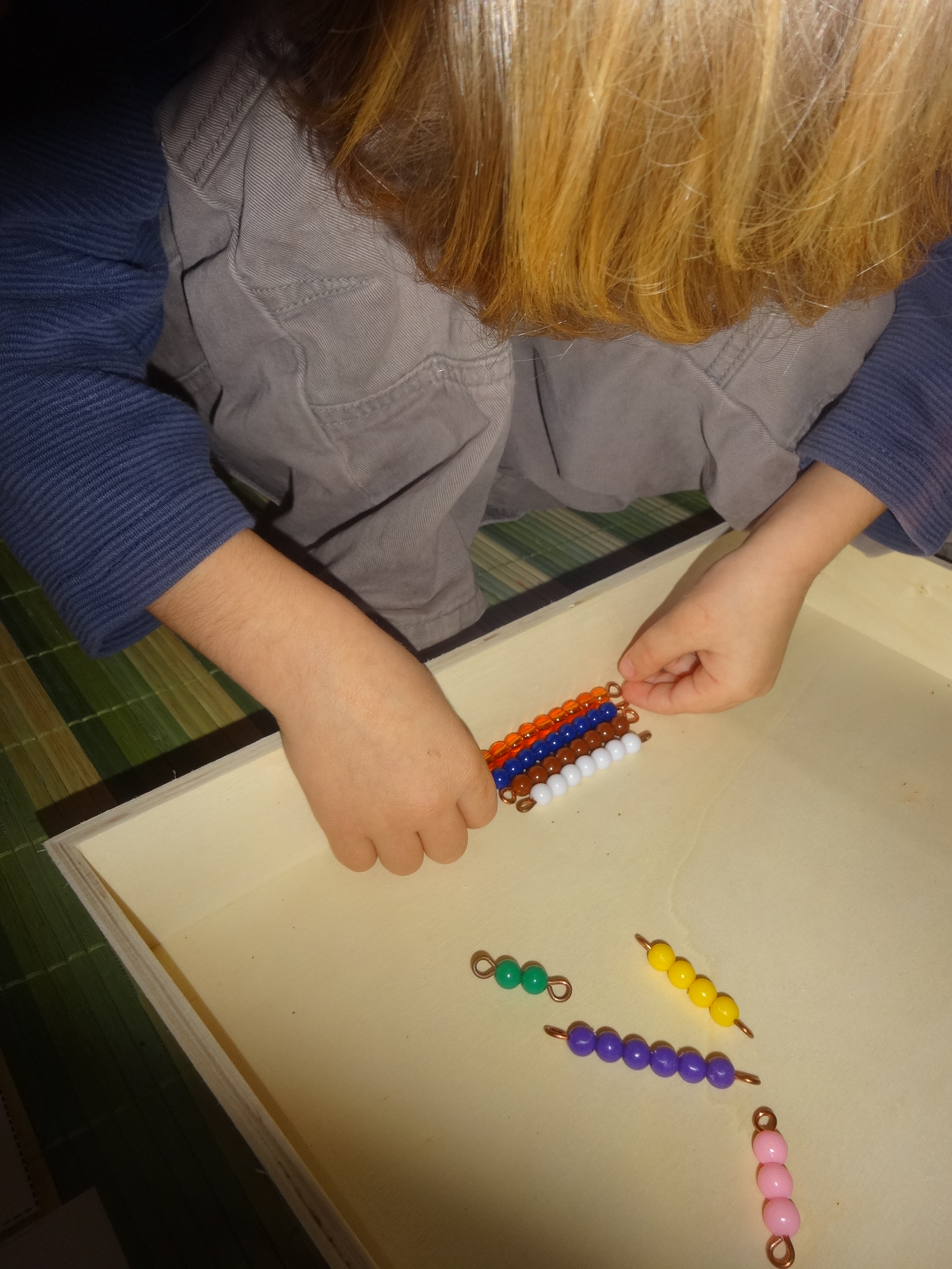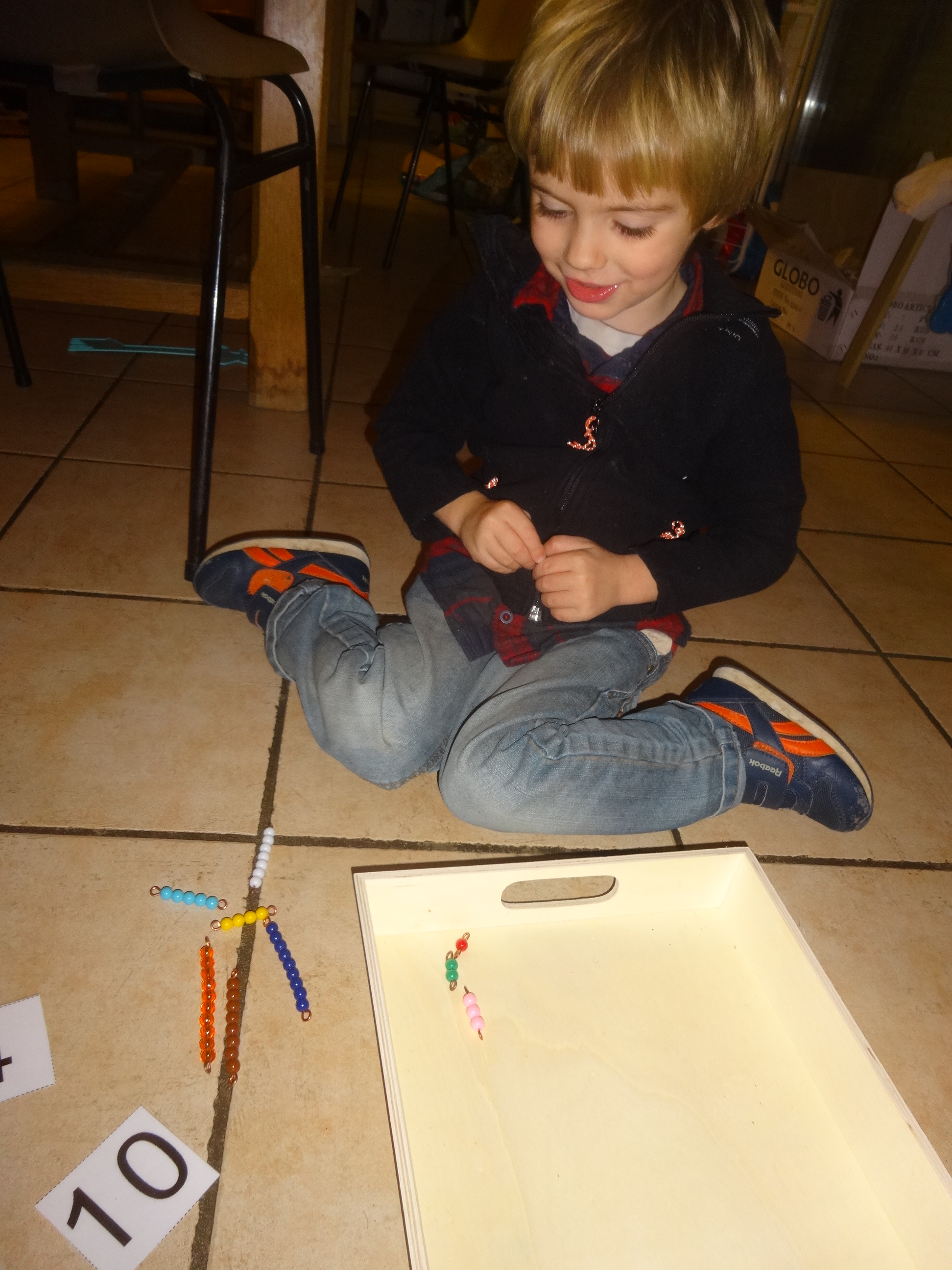 Une fois fait cela, il voulait continuer de jouer avec les perles. Comme il aime bien inventer des jeux, il me donnait des barrettes, il en prenait lui aussi et on comptait en même temps nos perles : 1,2,3 … Le premier qui s’arrêtait de compter en avait moins, il avait perdu. Ce qui était drôle, c’est qu’il disait ensuite : je vais t’en donner plus, et qu’on vérifiait en comptant. Puis je vais t’en donner m