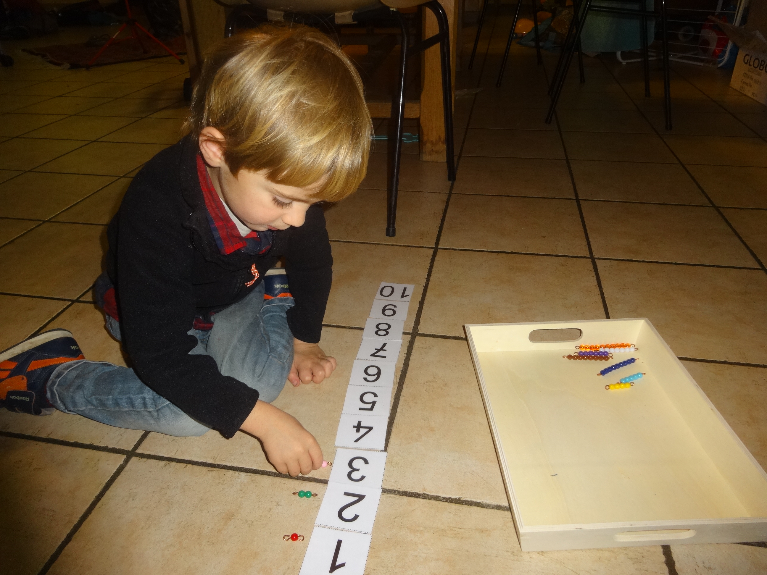 Puis je lui ai montré que l’on pouvait poser le 1 (le 2…) sur le zéro et compter combien on avait de perles en tout : 11 … il compte onze perles. (c’est là que je vois qu’il sait parfaitement compter au moins jusqu’à 15). Il voit bien ainsi que 11, c’est un dix caché (une barrette de 10) plus une perle. Il avait l’air très satisfait.
