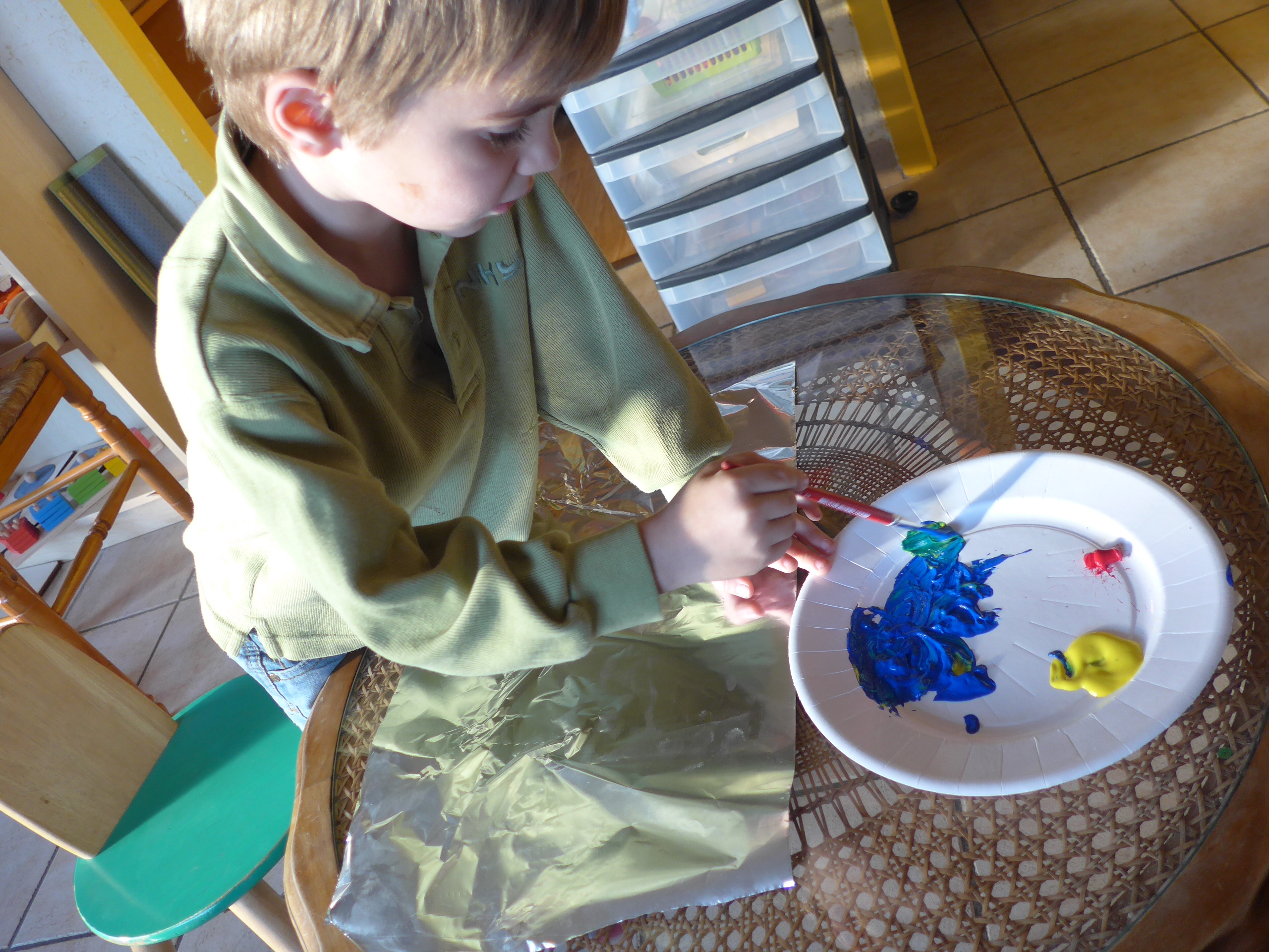 Je lui ai donc simplement proposé une assiette palette avec les couleurs primaires, des pinceaux et une feuille de papier aluminium.