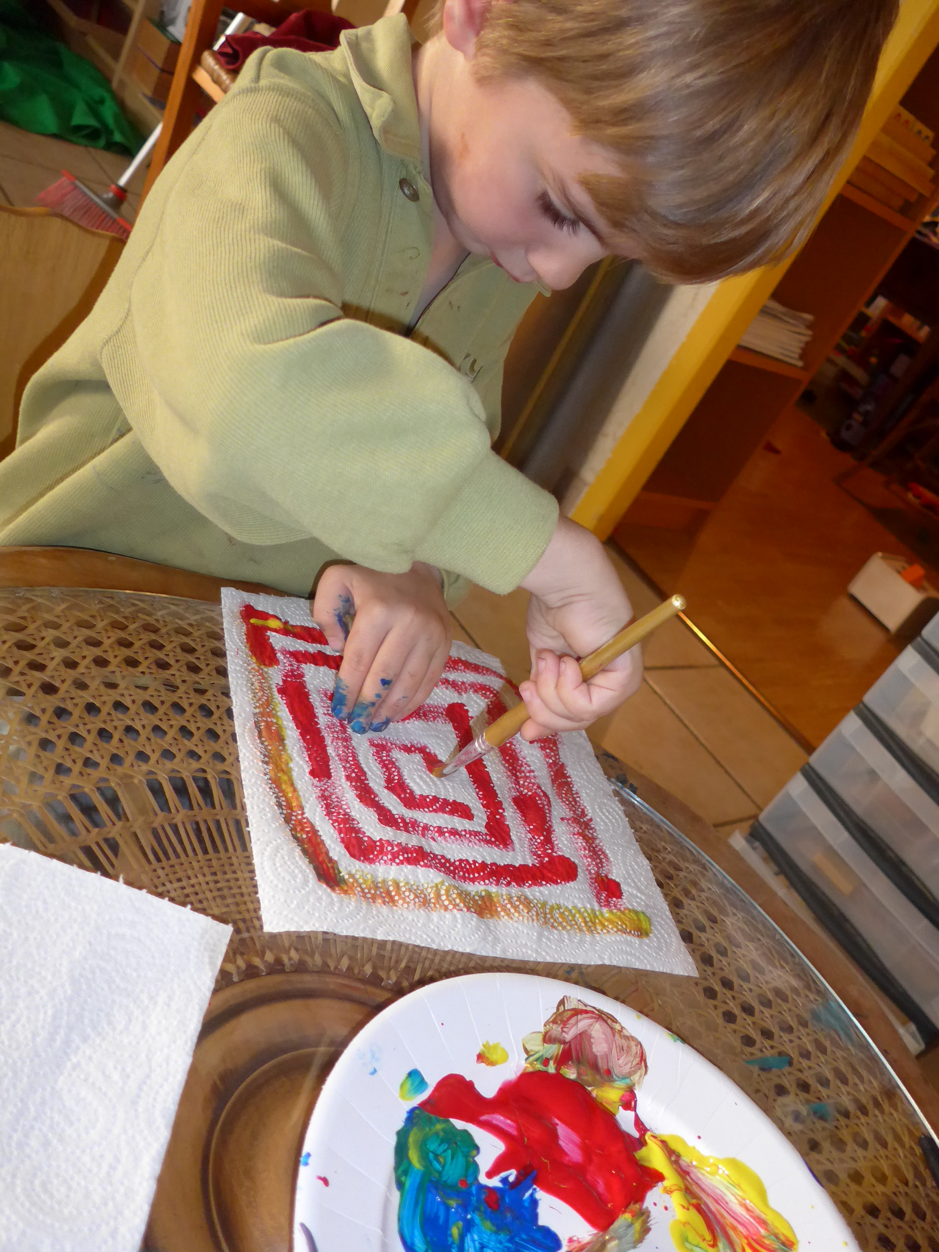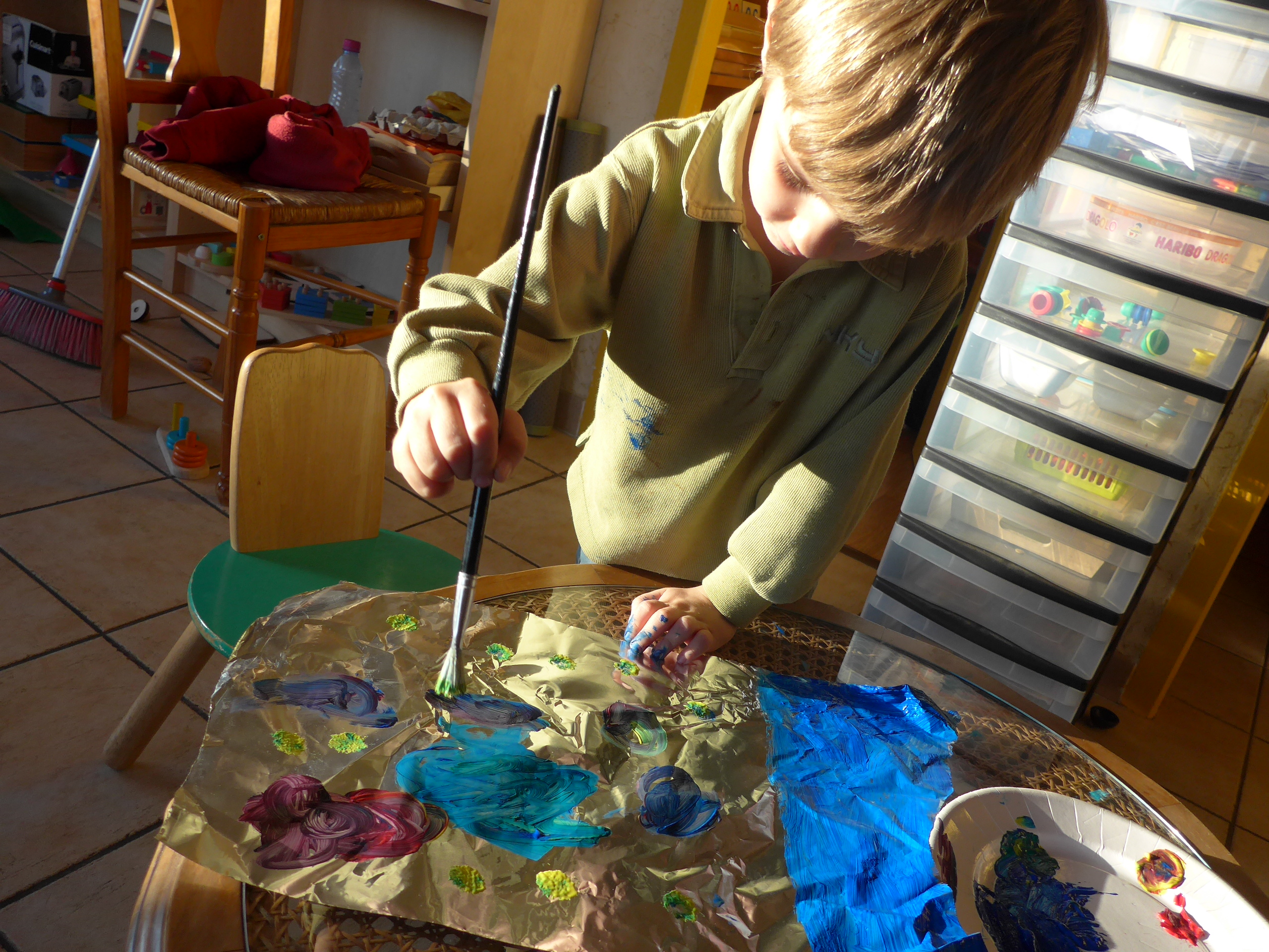 Cette fois ci, je ne lui ai pas fait les mélanges de couleur, pas mis un pinceau par couleur. Il avait à disposition plusieurs pinceaux et s’il voulait changer il pouvait ! Il a donc fait ses petites expériences de couleurs tout seul.