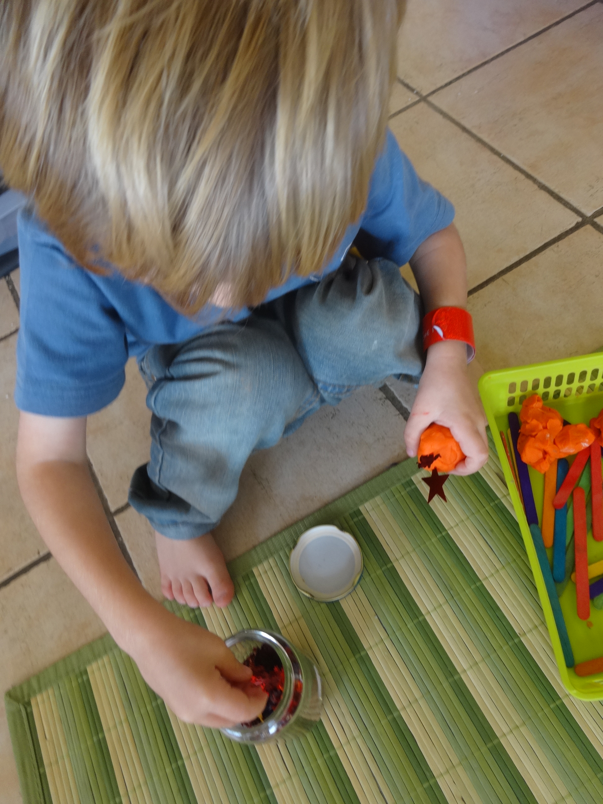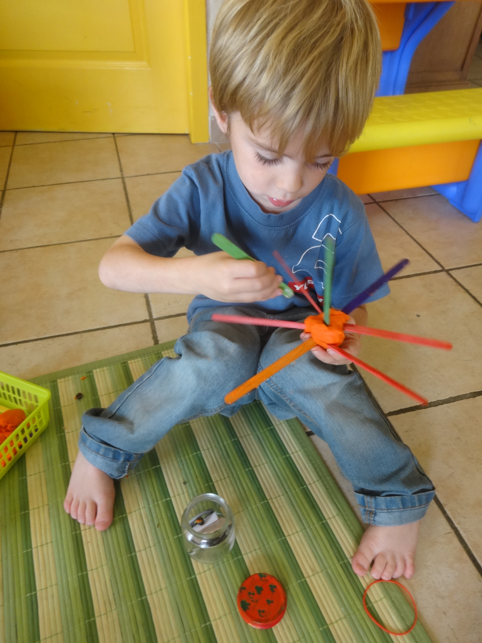 J’avais mis à disposition de Noé dans un de ses petits paniers une boule de pâte à modeler et des jolis petits bâtonnés colorés (toujours trouvés chez Si tu veux !)