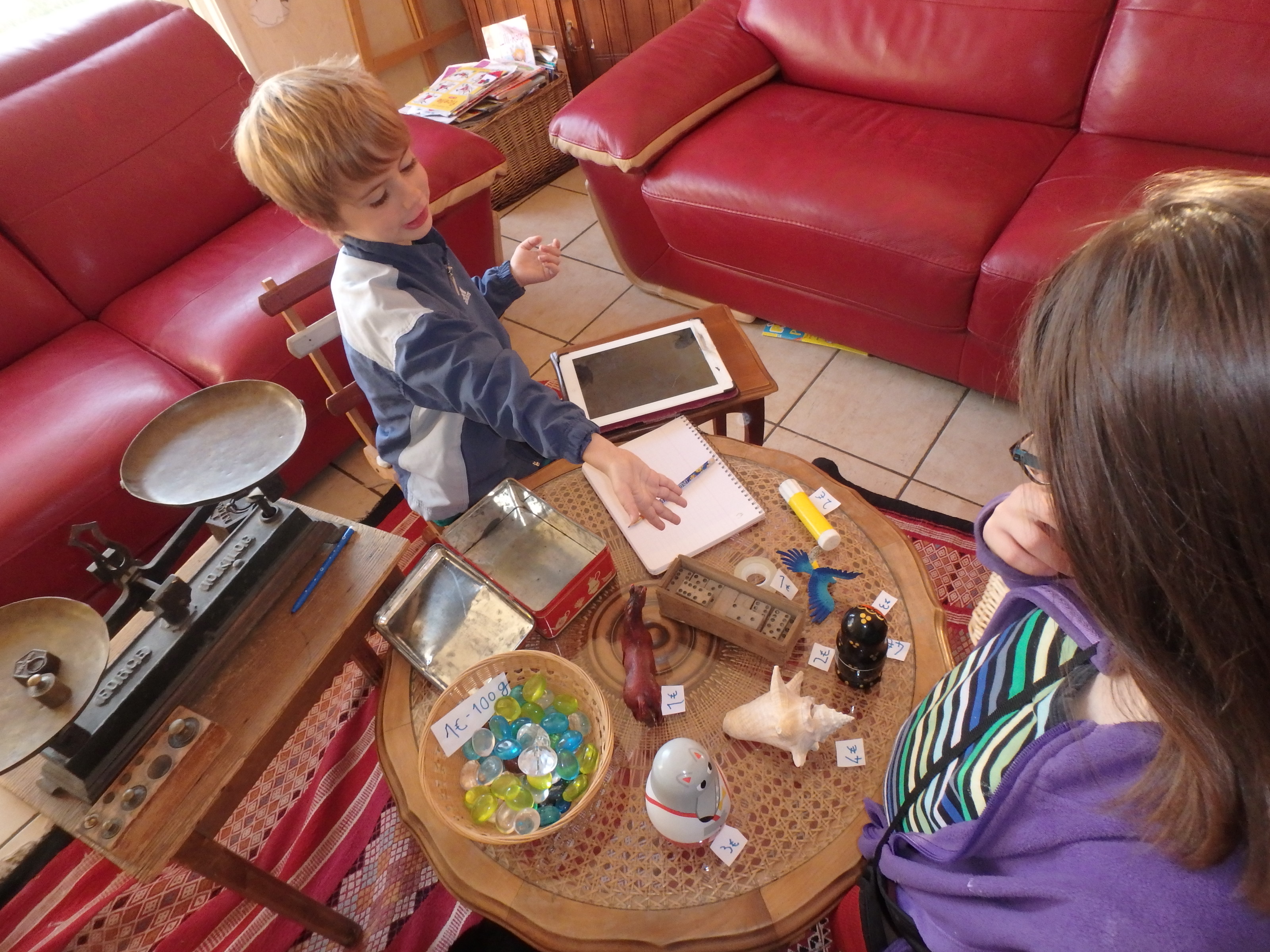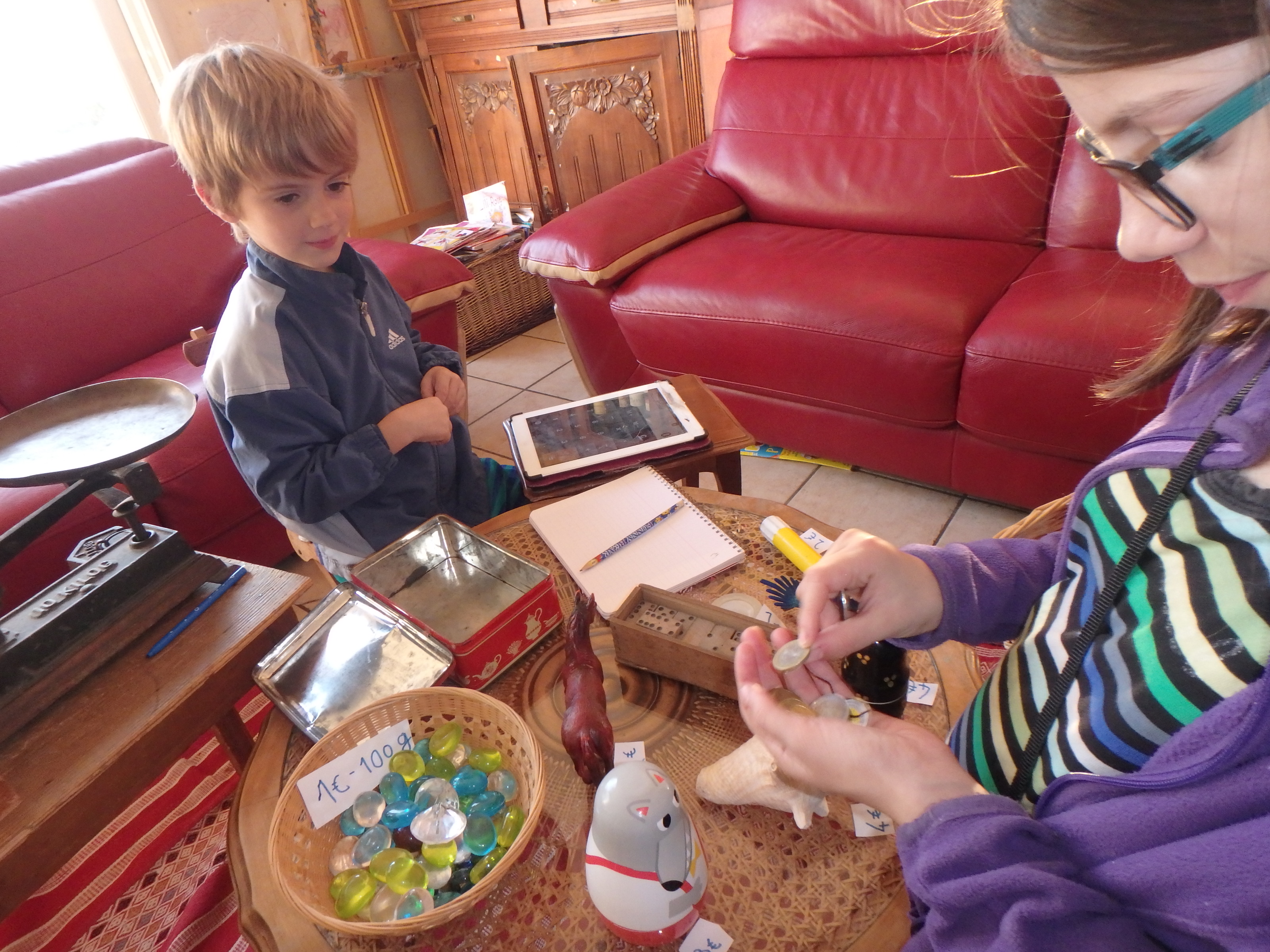 Et puis on change de rôles, le petit vendeur devient client … Et puis ensuite il change les objets à acheter … Il met d’autres prix … Je lui donne un petit cahier pour qu’il note le prix des objets achetés (3 euros le coquillage, 2 euros de pierres précieuses, 4 euros les matriochkas par exemple …) pour qu’il puisse ensuite additionner tout ça !