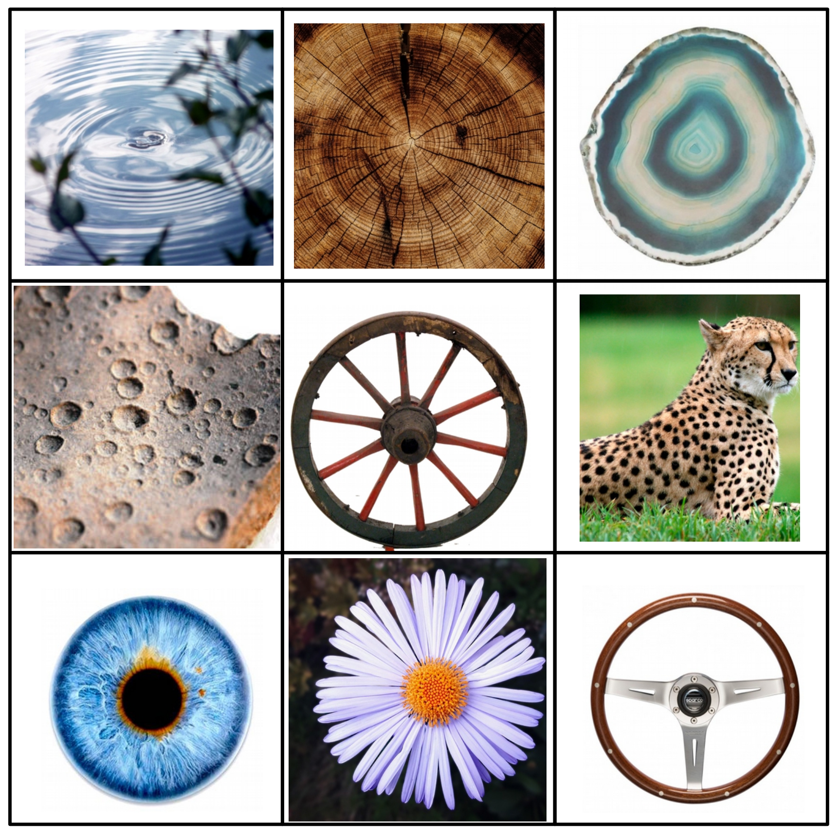« ROND » (ronds dans l’eau, souche d’arbre, agate, traces de gouttes d’eau fossilisées, roue, taches du guépard, iris de l’oeil, pâquerette, volant)