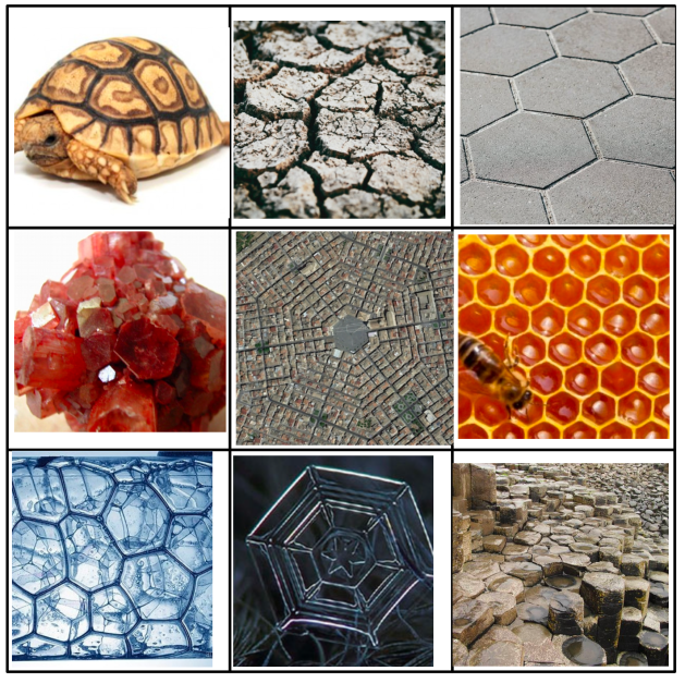 HEXAGONE ( carapace de tortue, terre séchée, carreaux, minéral ( aragonite), vue aérienne d’un quartier, alvéoles de la ruche, bulles de savon, flocon, formation volcanique de basalte de la Chaussée des Géants en Irlande)