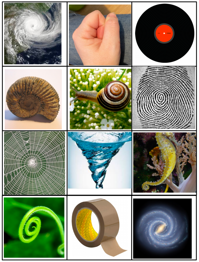 SPIRALE (cyclone, poing, sillons du disque, fossile d’ammonite, coquille d’escargot, empreinte digitale, toile d’araignée, tourbillon d’eau, queue de l’hippocampe, vrille d’une plante, scotch, galaxie)