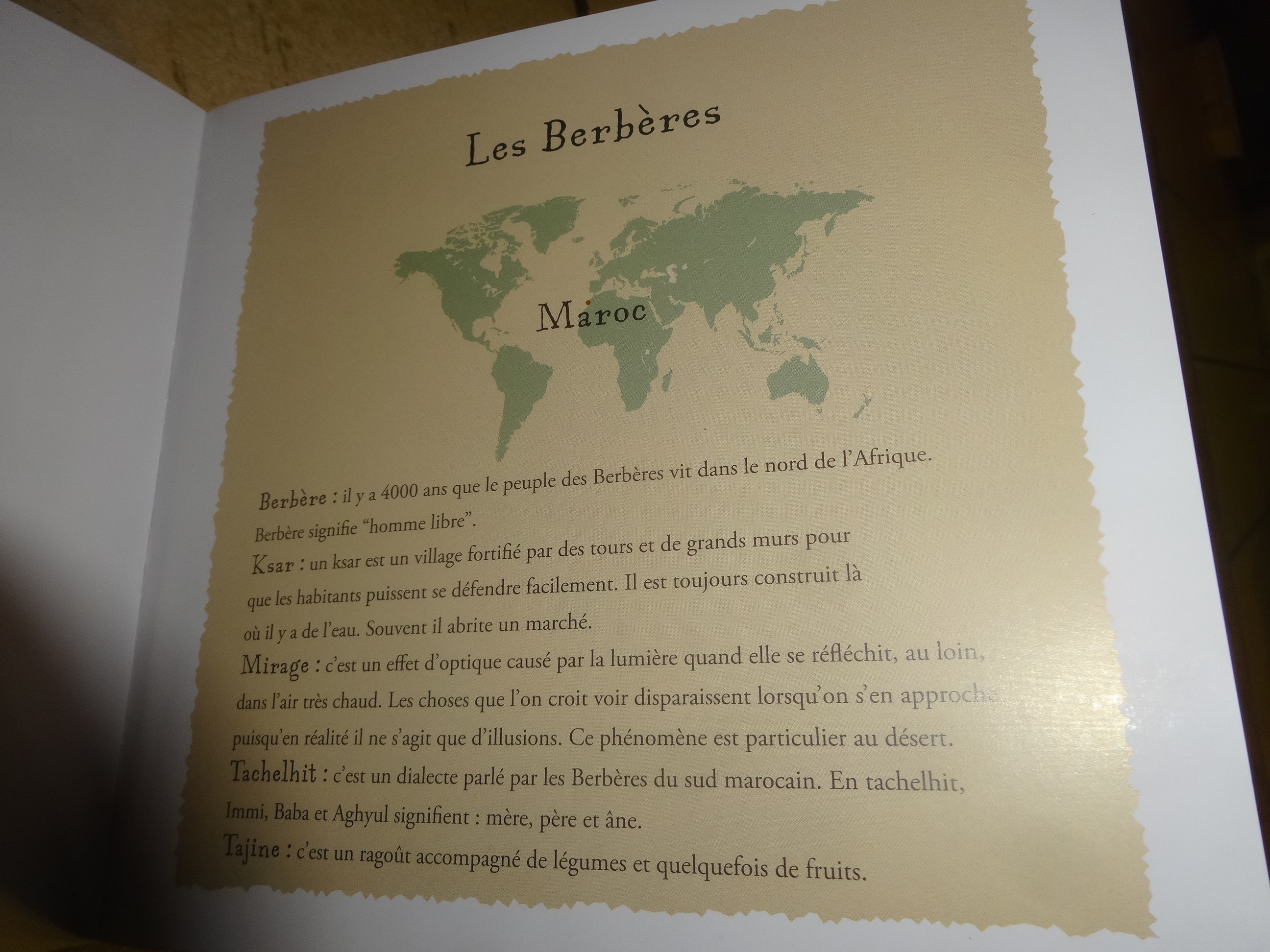 Et à la fin du livre, une petite page avec une carte pour situer le pays et du vocabulaire ou des infos sur le peuple dont il est question, ce qui était intéressant notamment avec ma Lison qui écoutait et regardait le livre par dessus l’épaule de son petit frère !
