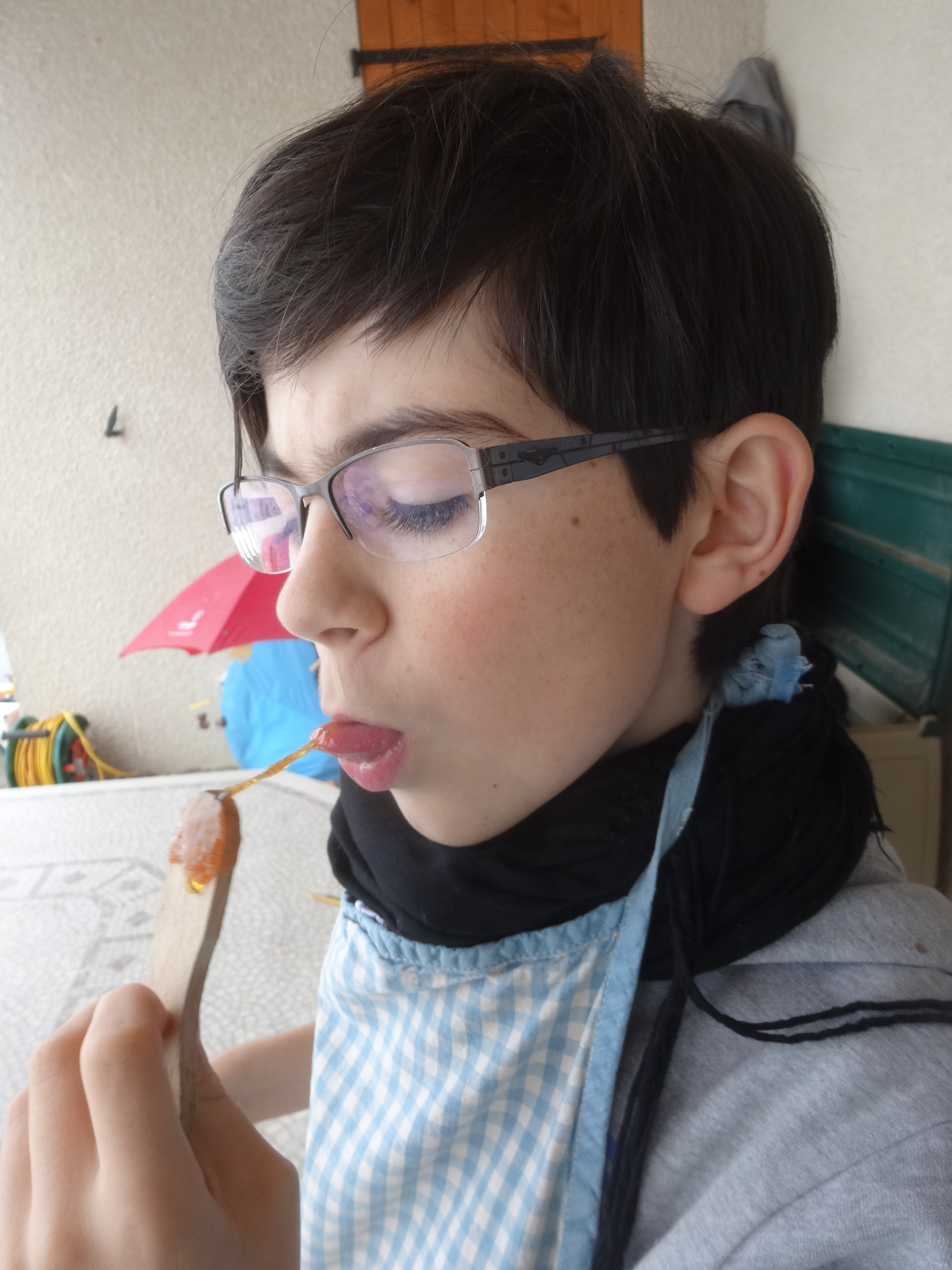 Alors il est allé faire un tour chez monsieur google et a vu que le sirop devait chauffer à 110 degrés.Ah ben voilà ! Heureusement, on a un thermomètre dans la cuisine alors c’est reparti !