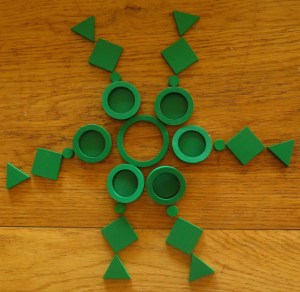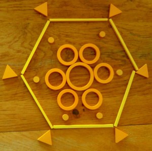 Donc avec Noé, nous avons choisi une couleur chacun, moi le jaune, lui le vert, et nous avons pris exactement les mêmes pièces : un rond central et six éléments de différentes sortes : 6 bâtonnets, 6 petits cercles, 6 points, 6 triangles puisque notre but était de faire des mandalas ! Au début nous nous sommes placés l’un à côté de l’autre, mais on peut aussi cacher ce que l’on fait pour ne pas s’influencer et ensuite avoir la surprise de nos deux constructions !