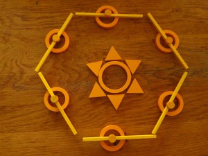 Puis on prend deux éléments identiques (deux anneaux jaunes) que l’on place de chaque côté du bâtonnet central, puis deux carrés orange, etc …