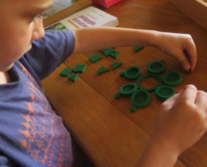 Et puis hier soir encore, on n’a pas pris de photo, mais Noé s’est intéressé à juste quatre losanges pour voir tout ce qu’on pouvait juste avec ces quatre formes ! C’était super intéressant ! La géométrie en jouant …