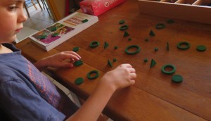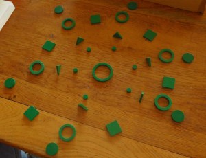 Firmin qui joue à son jeu favori avec le spielgaben : réaliser un village en associant primes et pyramides ou cylindre et cône.