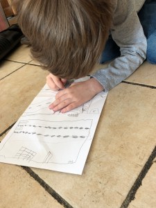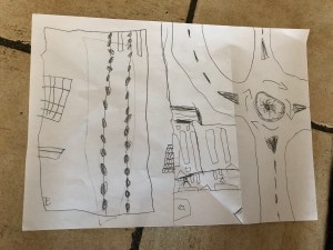 Il y a quelques temps, Noé jouait avec des petits maisons et des routes en bois, construisait un village puis dessinait le plan. (si vous voulez relire l’article, cliquez ici)