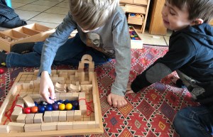 Le Spielgaben est à nouveau de sortie ces jours-ci ! Il faut dire que j’ai réorganisé les fiches, j’en ai fait de nouvelles à partir de photos trouvées sur le net pour se donner des idées ou même des créations que l’un ou l’autre de la famille avait fait précédemment ! C’est vrai que toutes ces boîtes mises côte à côte, ça fait rêver et ça donne envie de créer ! Ce qui marche très  bien aussi pour leur donner ou redonner envie d’y jouer, c’est lorsque je m’installe moi-même pour faire une activité spielgaben, j’ai souvent alors de petits curieux qui se joignent à moi !