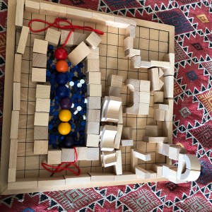 Voilà, spielgaben pour jouer, pour inventer, pour voir le monde d’une façon plus organisée, pour apprendre à maitriser ses gestes, pour apprendre, pour expérimenter, pour faire une activité avec un nombre limité d’éléments ou au contraire avec toutes les boîtes, pour jouer seul ou à plusieurs mains, pour représenter quelque chose ou faire une belle composition mais qui ne ressemble à rien de connu ! Mille et une façons de l’utiliser, de façon totalement libre ou très dirigée, tout est possible et c’est ce que j’aime ! Ca fait trois ans que nous l’avons, et je l’aime toujours autant ! A certaines périodes, il est un peu oublié et à d’autres, il sert quotidiennement ! Souvent, il suffit que je m’installe moi-même pour y jouer et hop !!! L’intérêt renaît et les enfants se précipitent !!!