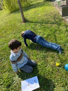 - Fabriquer ensemble un jeu de l’oie où sur chaque case il y a un geste physique à faire (saute 10 fois à cloche pied, fais 10 talons/fesses, …). On peut également sur le même principe réaliser un dé.