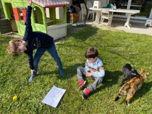 - Faire un grand parcours de motricité dans le jardin ou dans la maison en utilisant les objets à disposition pour sauter par-dessus des obstacles, courir vite, marcher sur une planche étroite, passer sur ou sous des chaises ou une table, faire une roulade sur un tapis, slalomer autour d’objets, lancer une balle dans un seau, marcher sur des pavés, sauter à cloche pied ou à pieds joints dans des cerceaux …