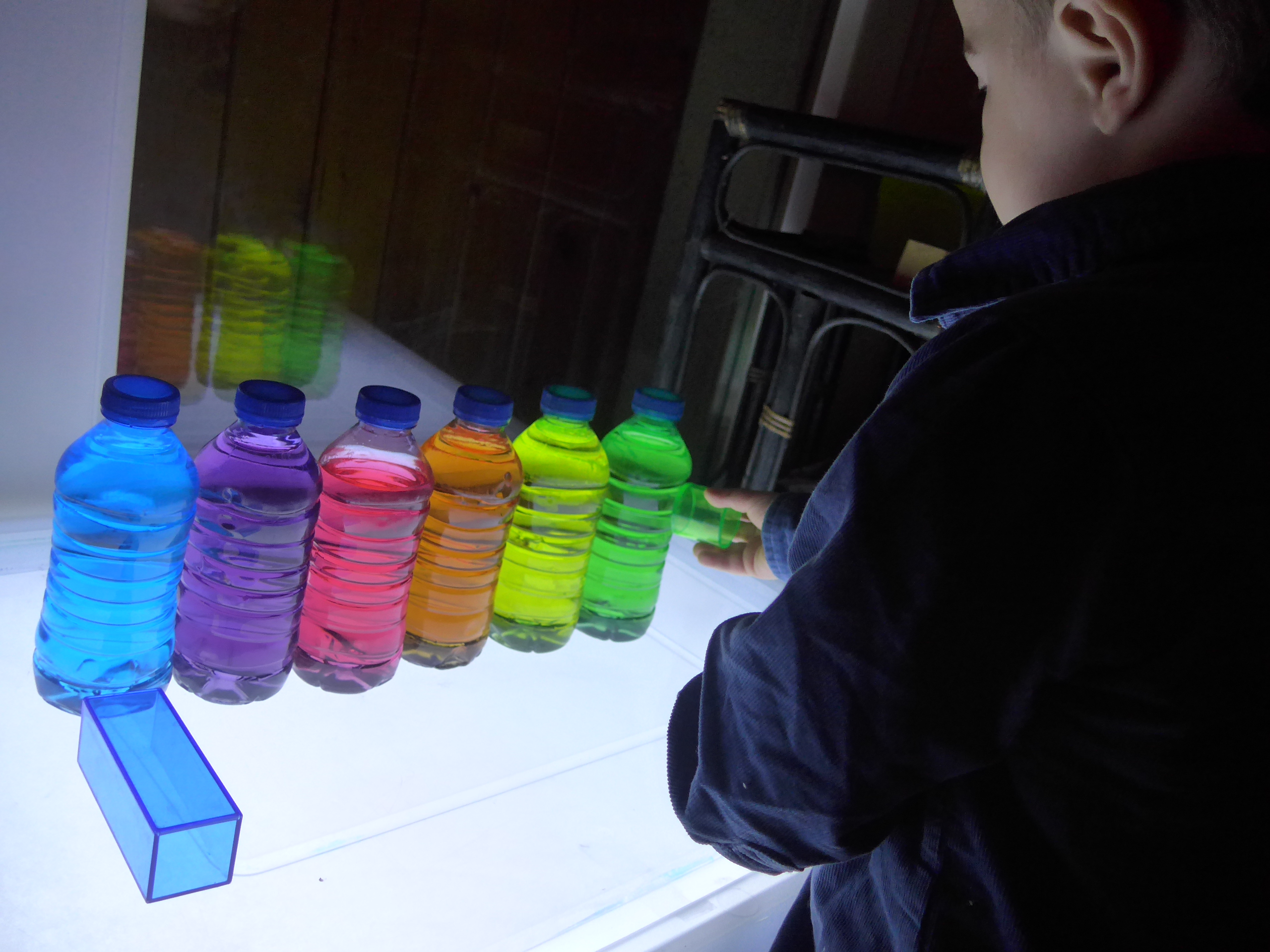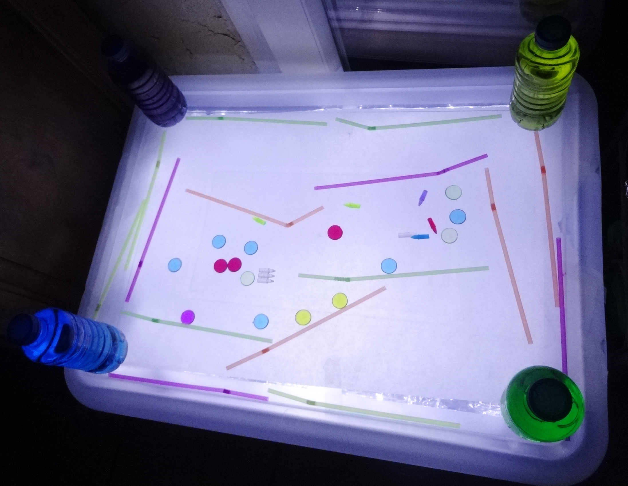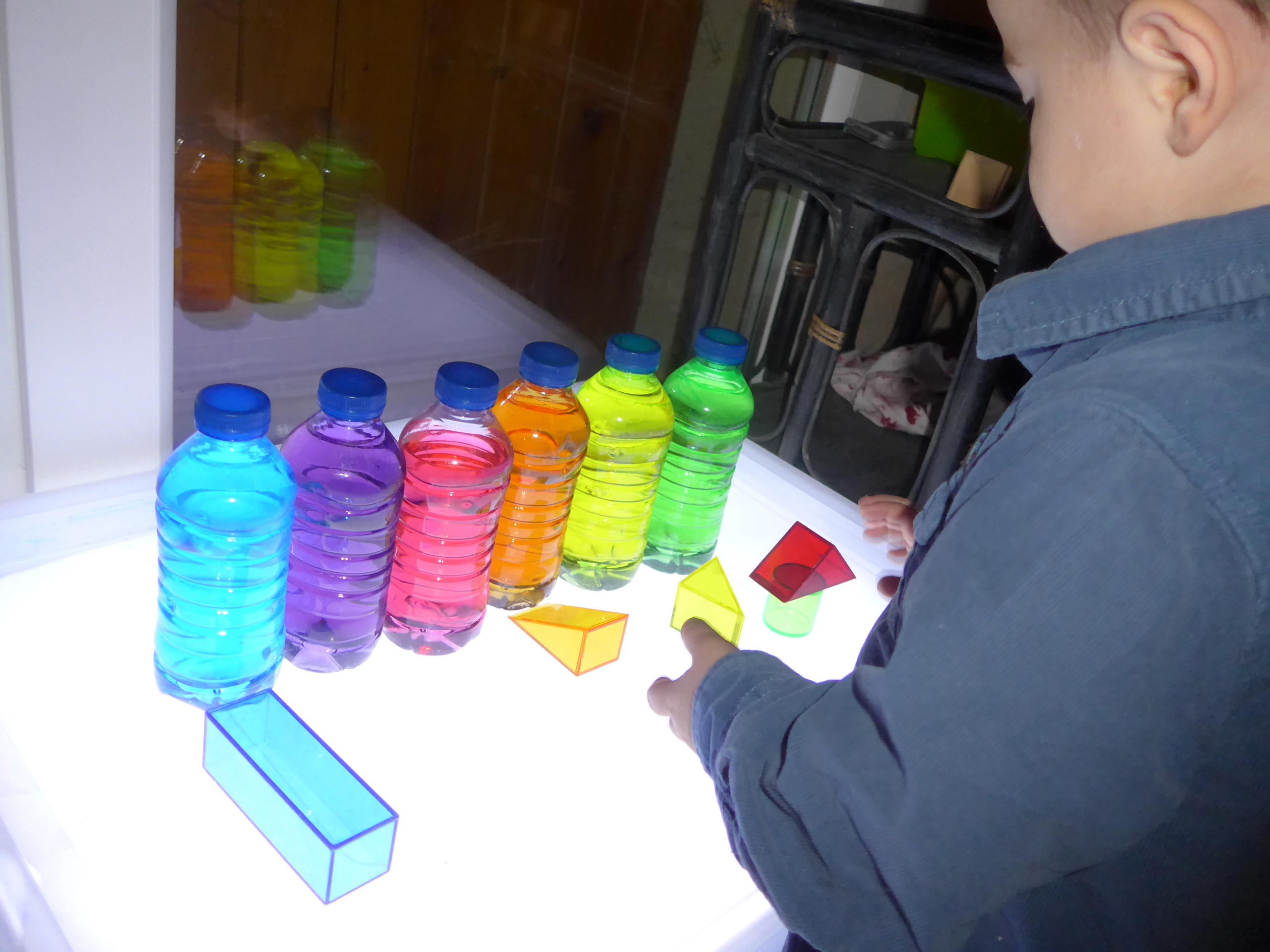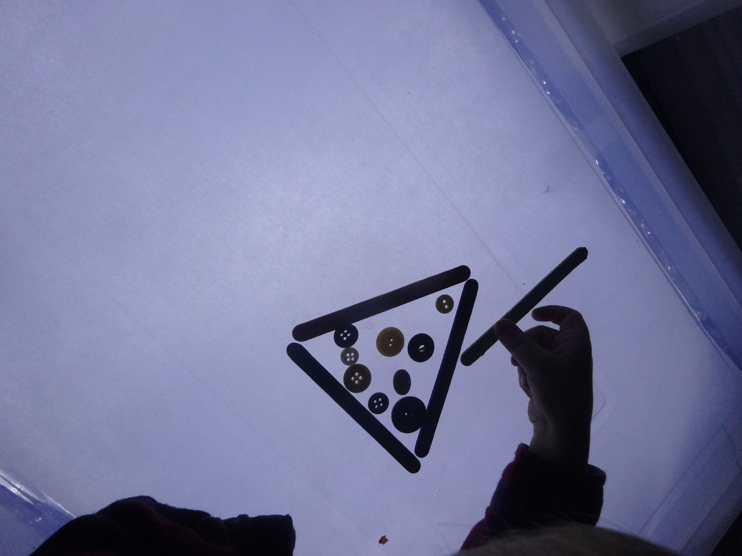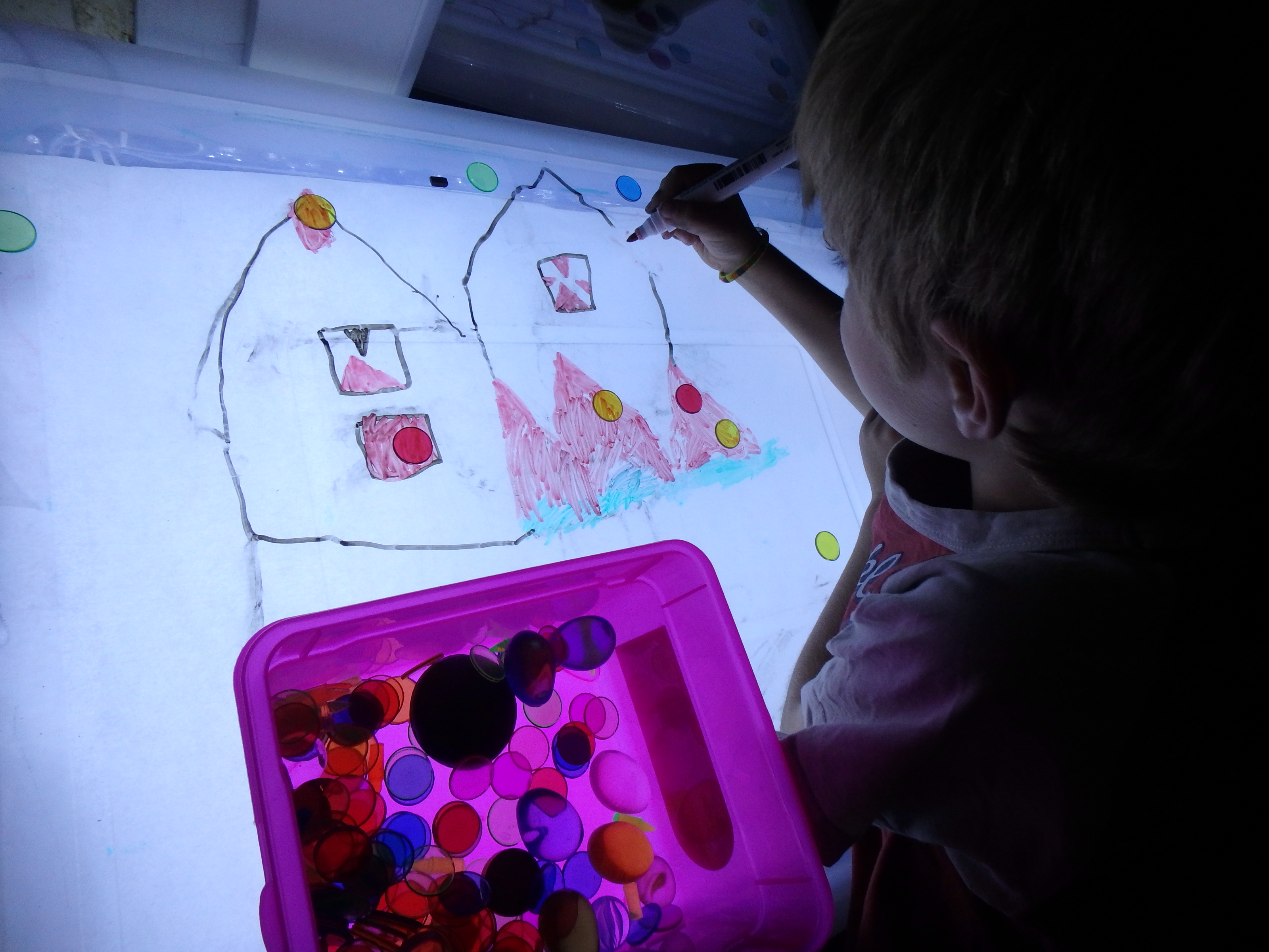 Installations aussi sur la table lumineuse, complétée par un dessin au feutre ! C’est une maison en feu m’a dit Noé.