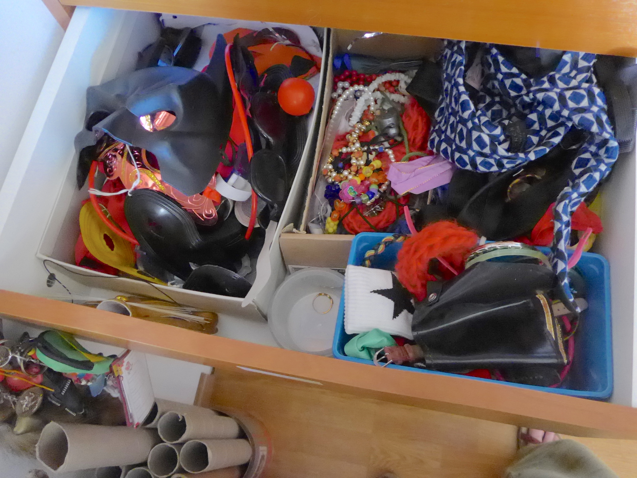 En détail, la boîte de gauche pour tout ce qui va sur le visage : masques, lunettes, nez de clown ou de lapin …