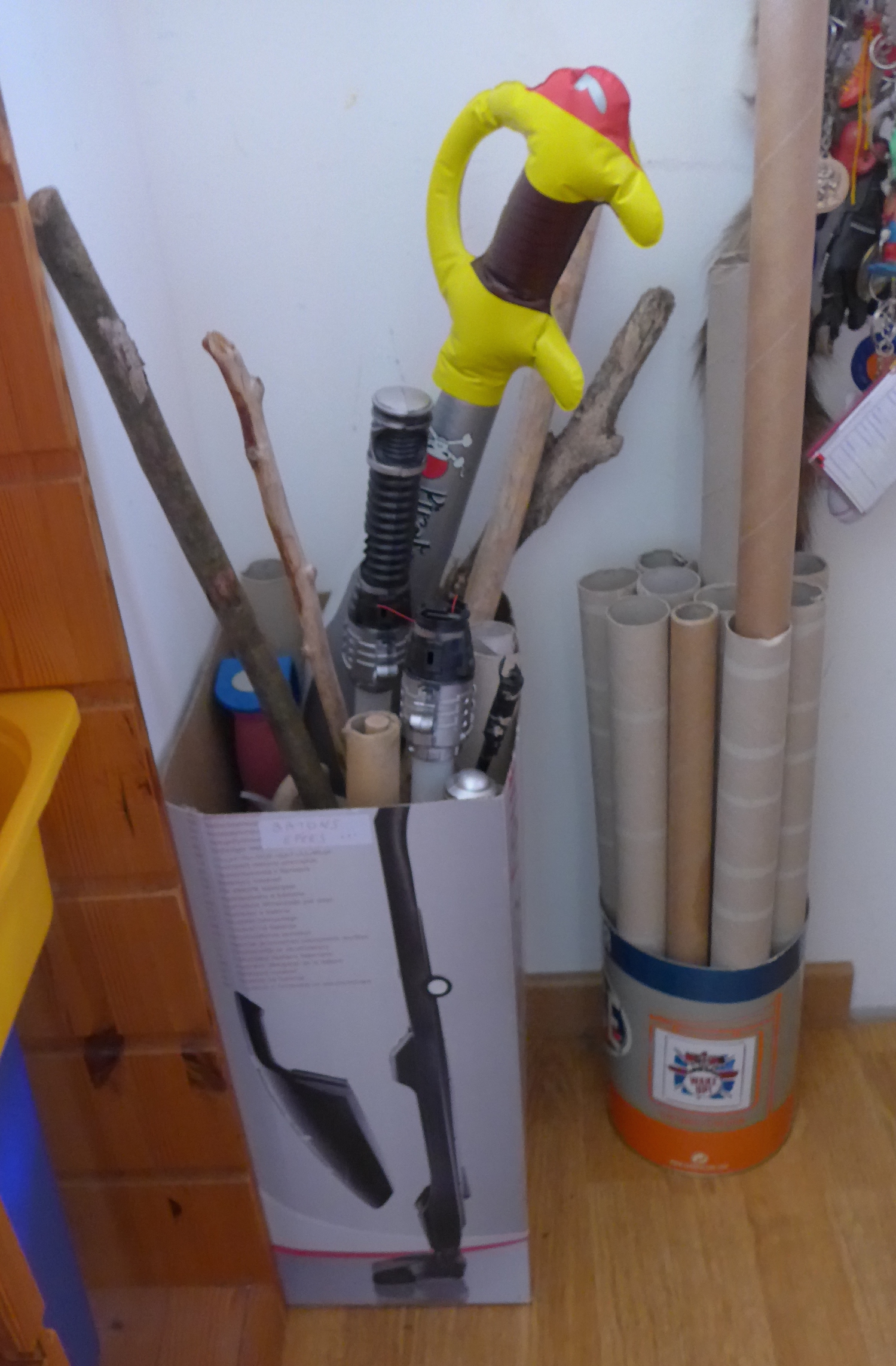 De longues boîtes (à décorer parce qu’elles sont moches !) avec dans l’une épées et bâtons, dans l’autre des grands rouleaux utilisés telles quels ou découpés, décorés pour tel ou tel usage !