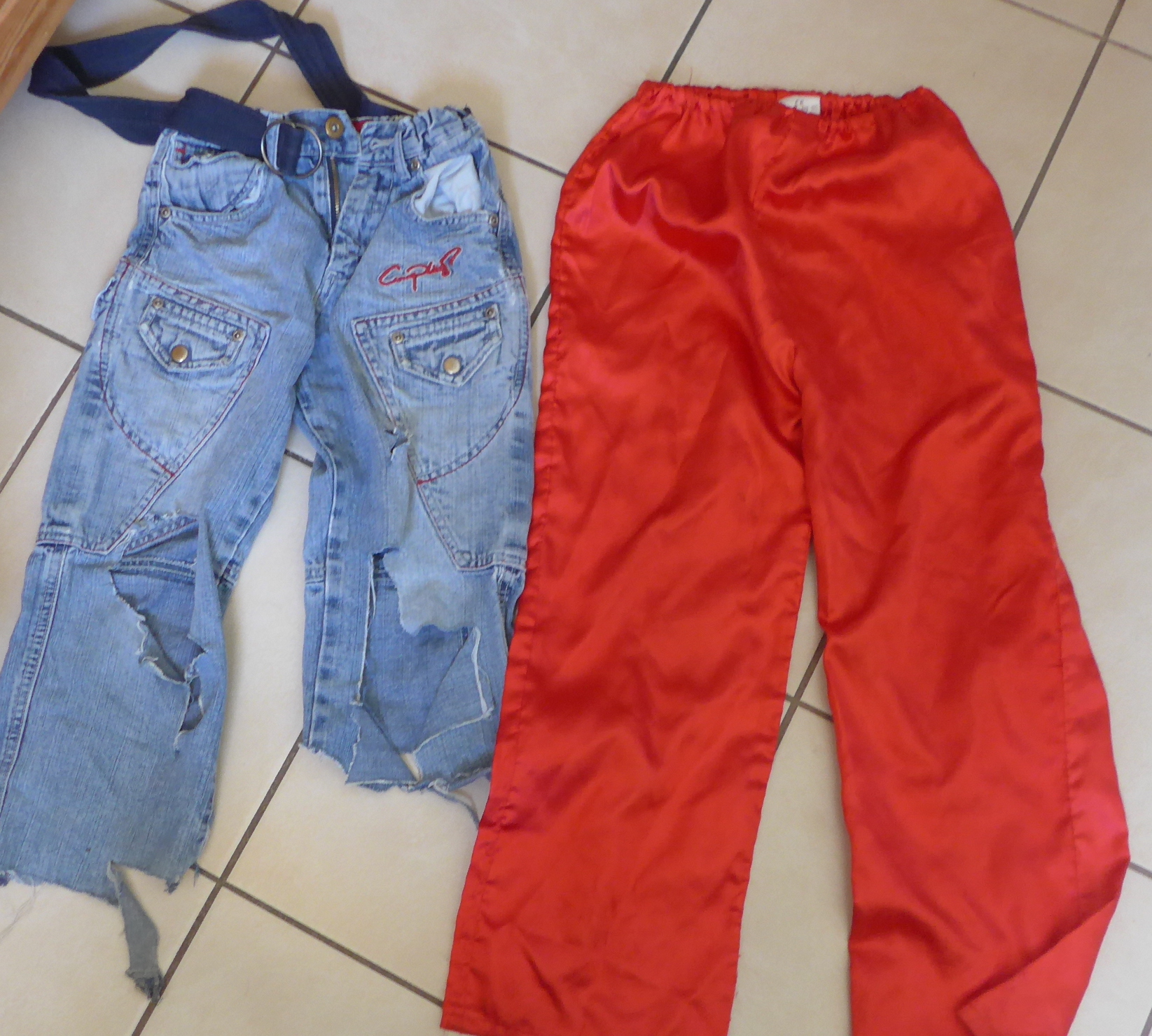 Commençons par les vêtements en eux-mêmes. Il y avait la possibilité de les classer par thèmes (genre pirates, …) mais très souvent ils utilisent par exemple le pantalon rouge du déguisement de pirate pour faire tout autre chose. Nous les avons donc classés par type de vêtements, en mêlant parties de « vrais » déguisements et vêtements récupérés qui sont soit des vêtements abîmés, tachés, déformés, qu’on ne met plus, donnés, récupérés dans le grenier d’une grande tante, souvenirs de vacances à l’étranger …