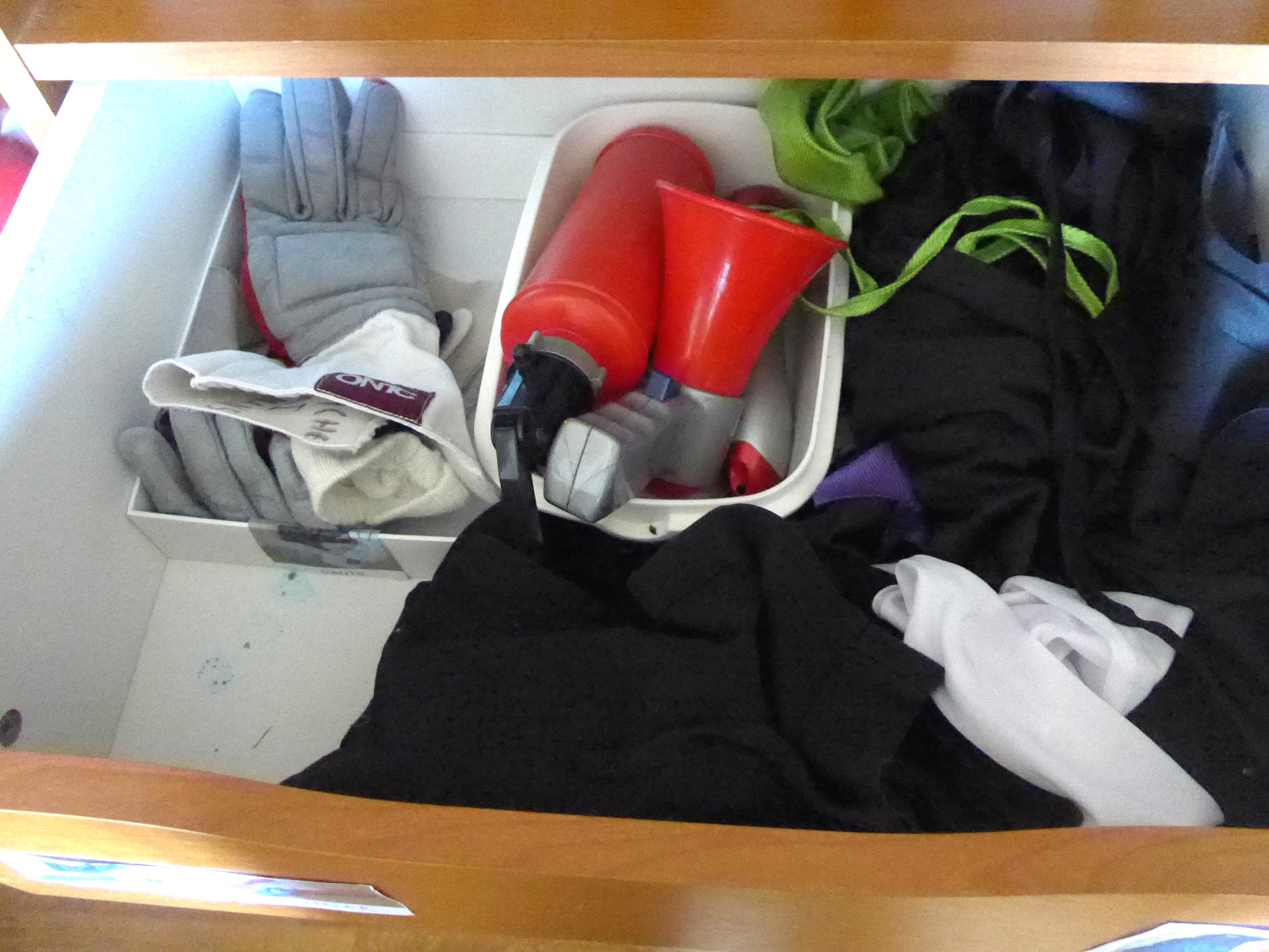 Au milieu, pantalons, shorts ou collants ainsi qu’une boîte pour les chaussettes (grandes chaussettes d’escrime qu’ils ne mettent plus, chaussettes dépareillés …)
